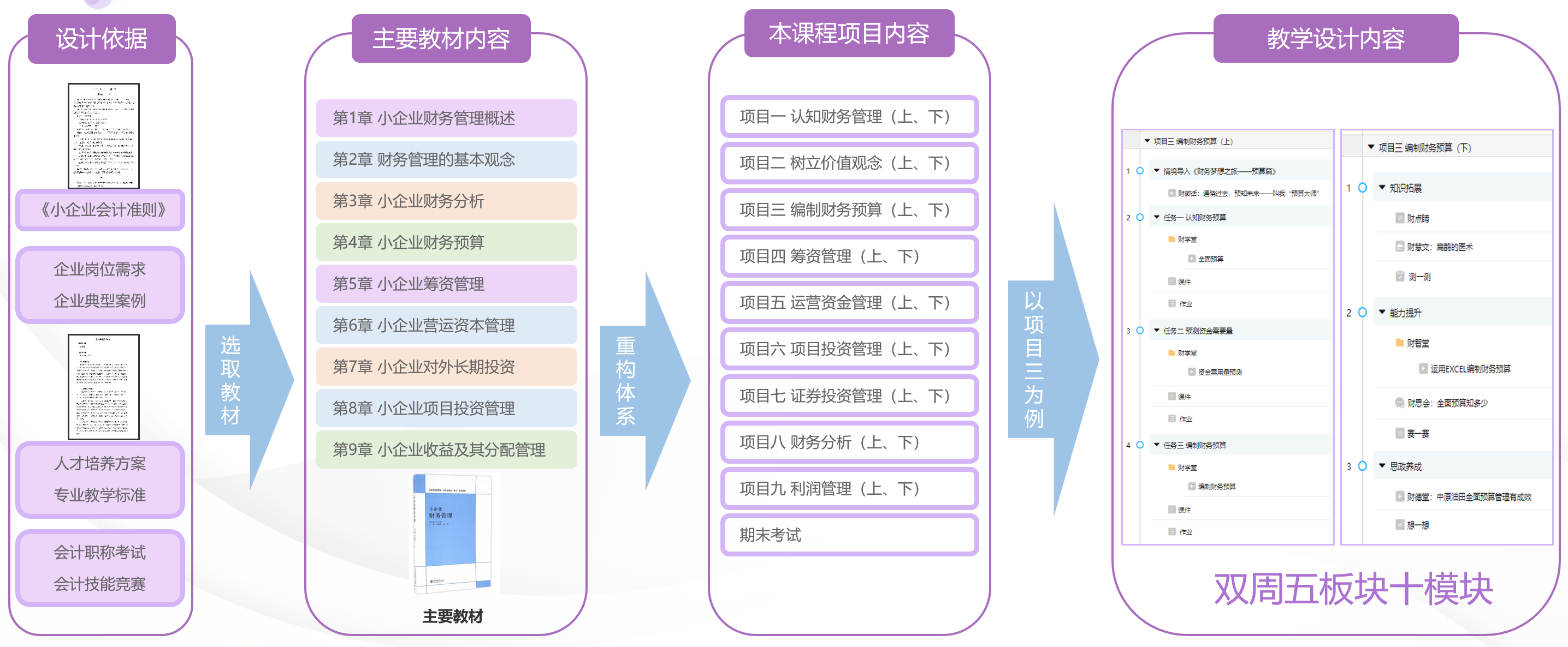 《财务管理》课程的设计基于高职学生学情,适应职业教育人才培养的需要,依据最新行业发展的方向,面向小微企业财务管理能力的培养,将课程内容分为九大项目,开展“双周五板块十模块”的教学活动。