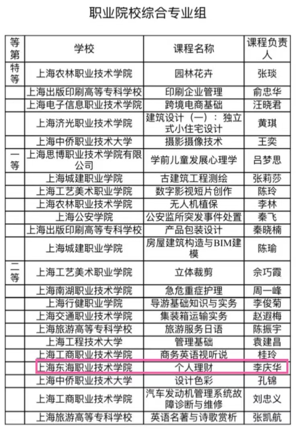 日前,首届上海市课程思政教学设计展示活动收官,全市150位高校教师脱颖而出获得奖项,我校经管学院教师李庆华《个人理财》课程荣获职业院校综合专业组二等奖。