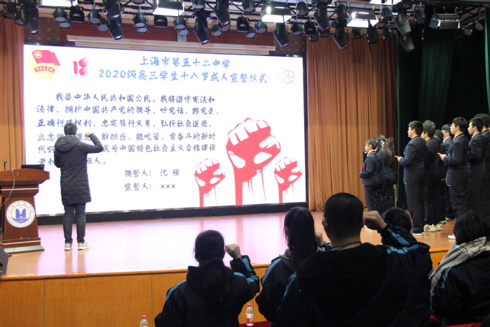副校长郁萍在学生成人仪式上致辞,代表学校对五十二中学师生们的到来表示诚挚欢迎,对同学们成年致以衷心的祝愿。郁萍简要介绍了我校自建校以来的发展情况,并寄语在座的同学们珍惜高中时光,努力拼搏,志存高远,如愿考上心中理想的大学。