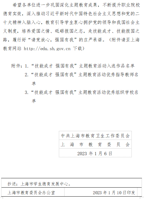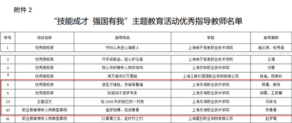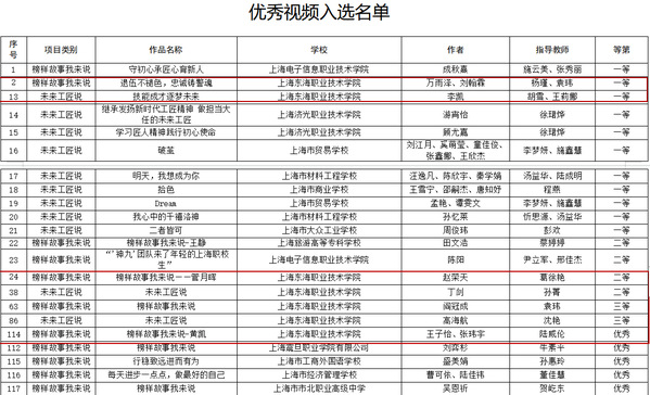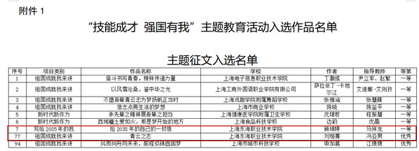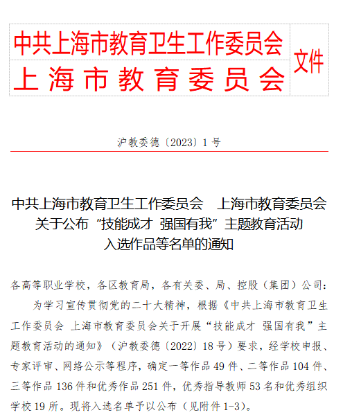 为学习宣传贯彻党的二十大精神,根据《中共上海市教育卫生工作委员会 上海市教育委员会关于开展“技能成才 强国有我”主题教育活动的通知》(沪教委德〔2022〕18号)要求。学校高度重视,从2022年6月起,学生工作部协同二级学院共同推进主题教育活动,共收集作品120余件。经学院推荐,学生工作部校内选拔,最终共选出19件作品参加市级复赛。经专家评审,我校共有11份作品荣获奖项,其中一等奖作品4项、二等奖作品3项、三等奖作品2项、优秀奖作品2项。共有6名教师荣获“优秀指导教师奖”,学校荣获“优秀组织学校”。
