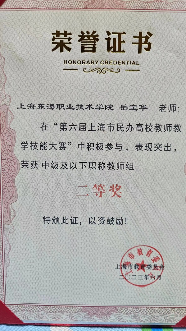 日前,市教委公布了“第六届上海市民办高校教师教学技能大赛”评选结果,东海学院社科部教师岳宝华凭借出色表现,喜获二等奖。