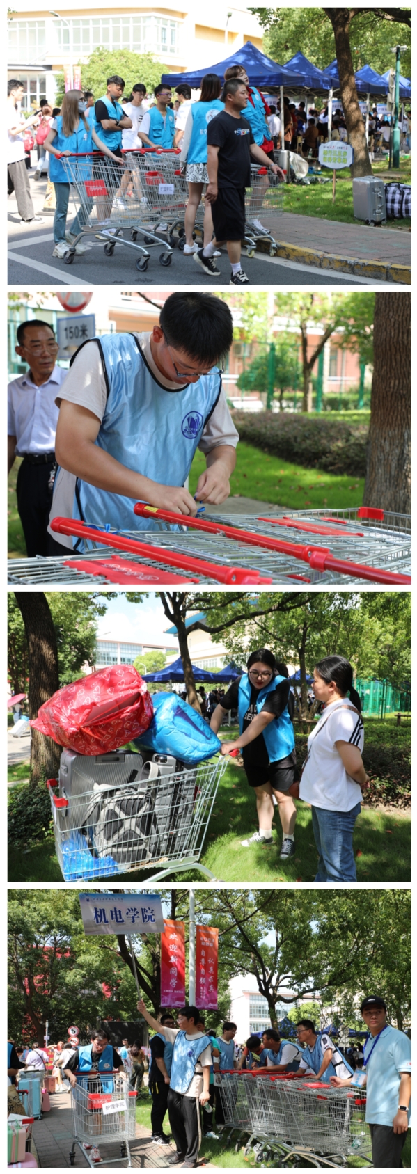 新同学报到也忙坏了志愿者们,在老师的带领下,他们分组开展工作,有的负责指引路线,有的负责帮忙托运行李,有的跑前跑后协助办理相关手续,他们在校园中忙碌的身影形成了一道美丽的风景线,奏响一曲爱心奉献的青春乐章。