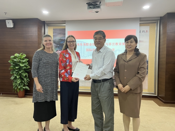 2023年10月8日,芬兰教育集群代表Sanna Nummela、国际关系总监Pauliina Holm、中方代表宋伟荣先生和培训主管曹煜来到东海学院洽谈合作事宜。校长王刚、艺术设计学院院长顾惠忠、教务处处长张居阳、国际交流办杨静参加会议,会议由副校长卓丽环主持。
