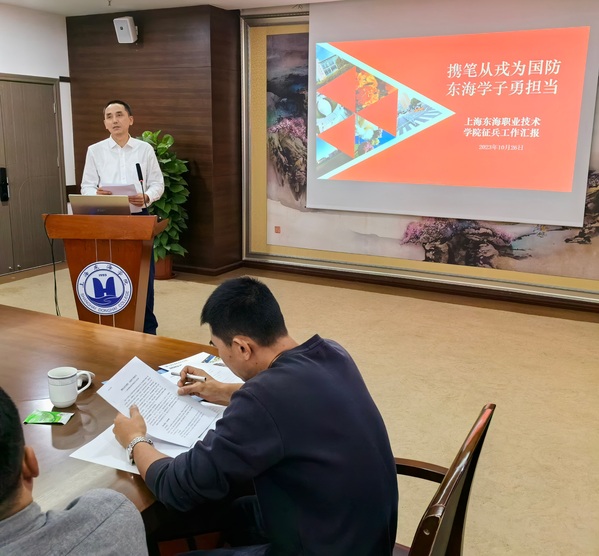 会上,丁良处长首先介绍了专项调研的背景与目的,他说:2023年我们再次启动调研,走访包括东海学院在内的十所高校,通过座谈、交流、访谈等方式全面调研高校在征兵工作中的特色做法,汇集保障高质量征兵的推进举措,研讨当前征兵工作面临的新情况和新问题。通过深入学习贯彻习近平总书记关于征兵工作的重要讲话精神,切实提高政治站位、强化责任担当,依法做好征兵各项工作。在完善大学生应征服务、抓好优质兵员储备方面,进一步拿出上海方案,高校办法,打造参军暖心、服役安心、退役放心全链条保障模式,全面推动全市高校征兵工作高质量发展。