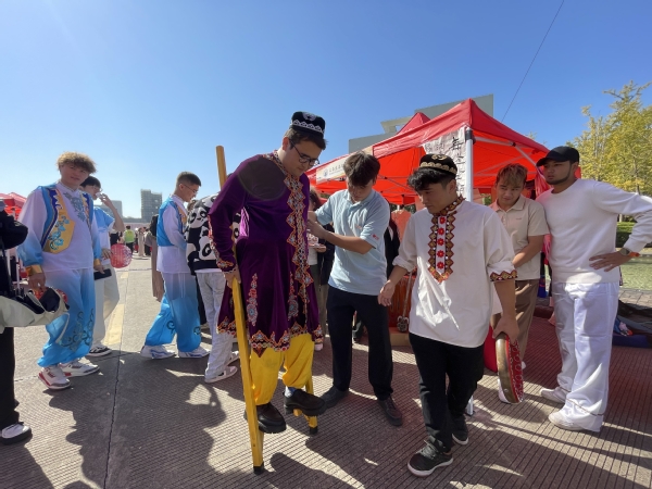 在民族游戏区,我校同学准备的“趣味踩高跷”互动游戏吸引了各高校参赛师生的热情参与体验,大家纷纷上前体验高跷的乐趣,同学们从步履不稳到健步如飞,不仅锻炼了协调性,平衡能力也有所增强,加强了不同民族对于彼此文化的了解,筑牢了他们中华民族共同体意识,赢得了各参展高校的高度认可。