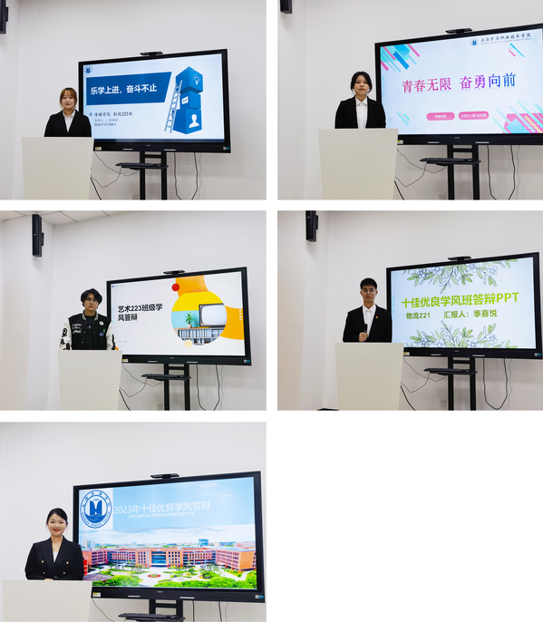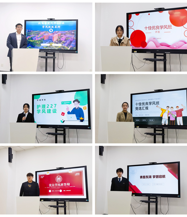 答辩班级以PPT形式展示班级学风情况、特色亮点、成效等内容,包括“利用新媒体加强学风宣传”“结合专业技能推动学风建设”“以学风实践项目开展特色学风活动”等,较好地展现了班级学风特色和班级风貌。评委根据考核指标和现场答辩表现进行打分,参会答辩师生共同参与投票,拟推荐电商223、汽修221、民航222、影视222、计技221、护理227、学前222共计7个班级“十佳优良学风班级”。