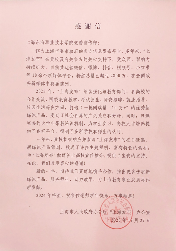 2024年新年元旦来临之际,上海市人民政府办公厅“上海发布”办公室给我校党委宣传部发来感谢信。感谢积极响应并参与“上海发布”的栏目征集、新媒体产品策划,投送了许多主题鲜明、富有特色的素材,为“上海发布”做好沪上高校宣传推介,提供了支持。