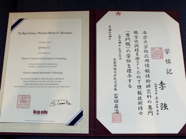 3月16日,传媒学院留学日本的传媒学子从异国他乡传来喜讯。20名学生已顺利完成了硕士阶段的学习,成功获得京都情报大学院大学硕士学位证书。