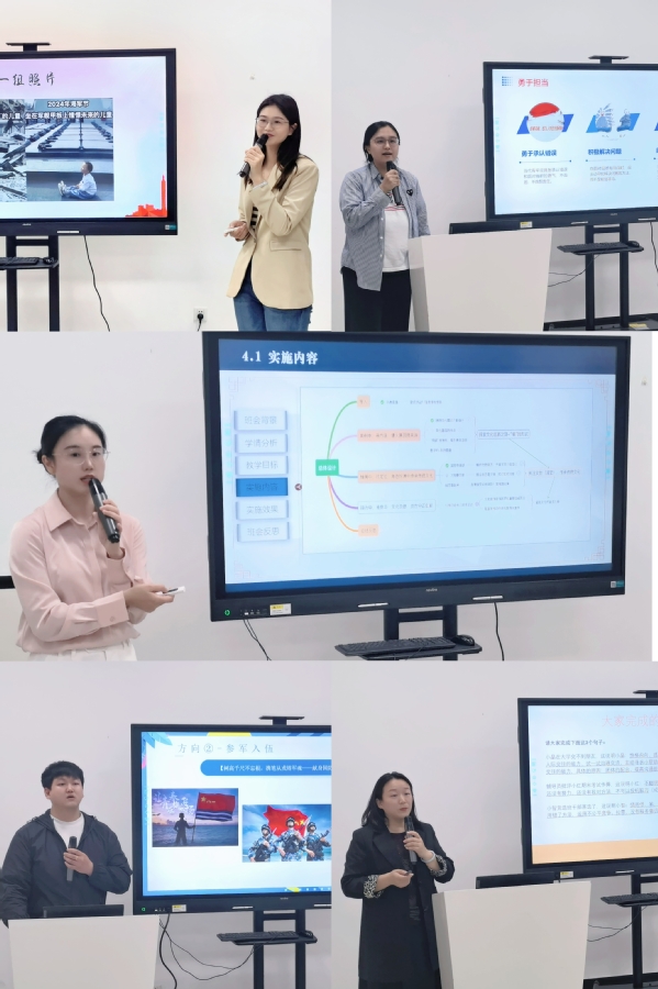 接着,五位辅导员进行主题分享。经管学院辅导员黄周瑶以《厚植爱国情怀,勇担时代使命》为主题。班会用“一组照片”“一首歌曲”“一场对话”“一块金牌”“一则故事”“一份问卷”激励学生们要接过时代的接力棒,坚持爱国爱党,为谱写更加绚丽的时代华章而不断奋斗。机电学院辅导员代征以《接好新时代的接力棒——新时代中国青年的使命担当》为主题,通过深入探讨新时代中国青年的使命和担当,激发学生的爱国情怀和社会责任感,明确自身的人生目标,引导学生树立正确的价值观,担当时代赋予的使命。艺术设计学院辅导员李维庆以《助力毕业生跑出就业“就业加速度”》为主题帮助同学们了解专业的未来发展以及自身就业能力,激发同学们自觉投身工作岗位,努力实现职业价值。护理学院辅导员谈静围绕《发展成长型思维,塑造更好的自己》为主题,以提升“发展成长型思维”为目标,从“举例子”到“摆事实”,帮助同学们进行成长型思维的培养和塑造,成为更好自己。教育学院辅导员焦庆超以《国宝皆可潮——坚定文化自信自强》为主题,以“非遗漆扇”导入班会,从“国宝会说话”到“国宝潮起来”,帮助同学们更深刻地了解传统文化内涵,激发学生厚植爱国情怀,提升文化自信,践行文化传承使命。