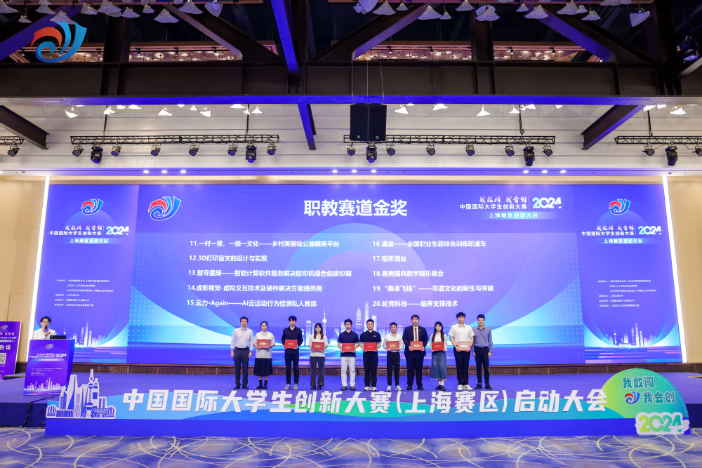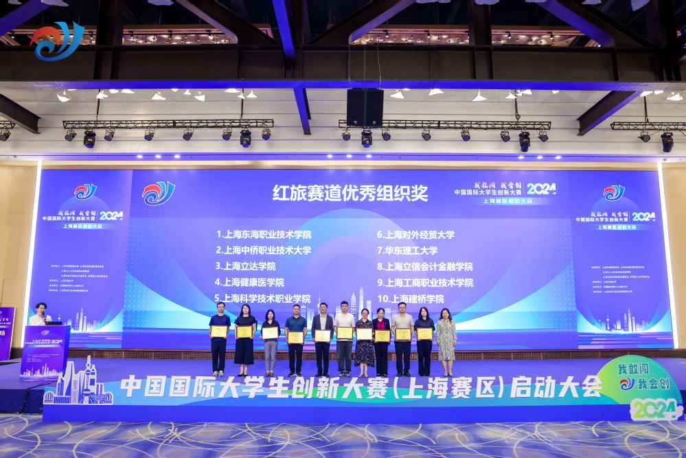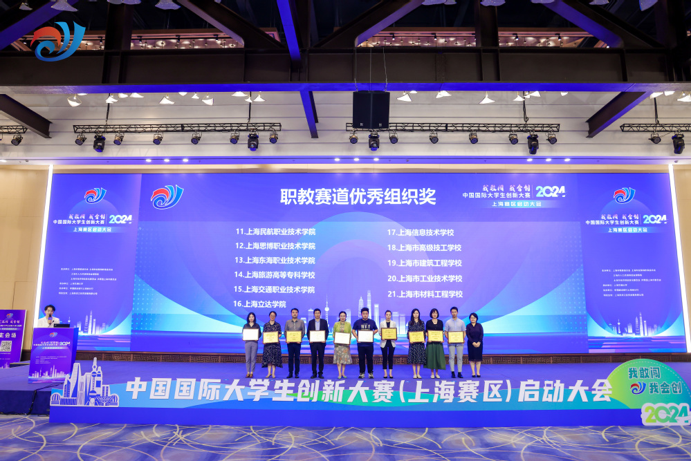 6月13日下午,2024年中国国际大学生创新大赛上海赛区启动大会在大零号湾科创大厦举行。本次活动由上海市教育委员会、上海市发展和改革委员会、上海市人力资源和社会保障局、上海市经济和信息化委员会、共青团上海市委员会共同主办,上海交通大学、上海市学生事务中心、上海市高等教育学会高职高专创业教育专业委员会、上海农林职业技术学院、上海市工业技术学校承办,中国建设银行上海市分行协办。上海市本科高校、高职高专院校、中等职业学校400余名师生现场参会。学校副校长郁萍应邀出席本次启动大会并担任颁奖嘉宾,招生就业处及上届金奖项目团队代表参加启动大会。
