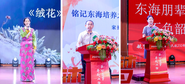 董事长曹助我代表董事会致辞。东海学院已建校三十一周年,在师生共同努力下,在各级各类大赛中展示青春风采,收获累累硕果,取得了骄人的成绩。希望全体2024届毕业生,以终身学习为追求,以勤奋态度为秘诀,以坚韧毅力为勇气,以合作共赢为力量,以感恩的心为滋养,争当新时代工匠。教育学院学前217班代青依仲作为毕业生代表为母校献唱《绒花》,感恩学校领导、老师们的栽培,祝福东海学子们绽放更绚烂的青春之花;经管学院关务214班董彦雯的父亲作为毕业生家长代表嘱咐毕业生铭记东海培养之恩,勇做时代新青年;航空学院民航232班邵诗瑶表达了对师兄师姐们的感谢,希望能充分发挥朋辈力量做好东海青年。马克思主义学院院长龙燕作为教师代表发言,她以临别三言,告诫青年应善于把握机遇,做不负青春、不负韶华的新时代青年。