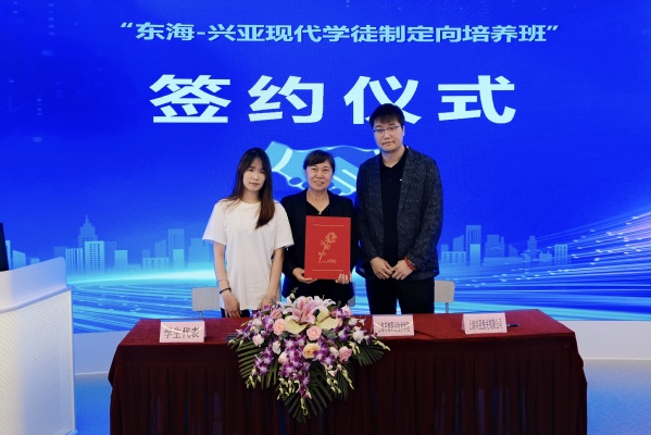 在中国报关协会及上海市报关协会领导的见证下,副校长卓丽环、兴亚副总金晨宇、学徒王佳慧代表三方共同签约。