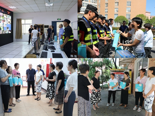 校领导们先后来到后勤保卫处、总值班室、招就处、监控室、校门卫及男女生宿舍门卫,与教职工们亲切交流,详细了解他们的工作情况,倾听他们的心声,对大家的辛勤付出表示感谢,并将清凉礼包送到大家手中。同时也叮嘱大家天气炎热要注意防暑降温,劳逸结合,确保身体健康和工作安全。