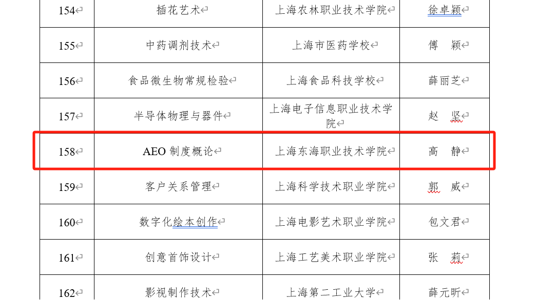《AEO制度概论》课程2022年获批上海市精品在线开放课程,2024年3月,被上海市教委推荐申报国家精品在线开放课程。在12年的课程建设中,在学院的大力支持下,高静带领课程团队成员一路前行、倾心锻造,紧紧抓住“互联网+教育”“智能+教育”的时代需求,全面推进《AEO制度概论》课程改革,深化教学理念创新、课程体系构建、教学方法改革和教材建设提升等,探索线上线下混合式教学,把《AEO制度概论》课程建设成为了具有较高教学水平和广泛示范辐射作用的在线开放课程,为培养“通晓归类,通晓制单,通晓合规,通晓操作,达到国际标准”的“四通一达”关务技能人才奠定了基础。