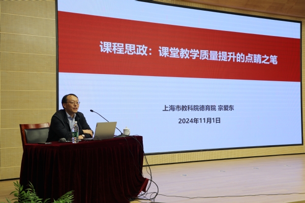 11月1日下午,由校课程思政工作领导小组主办,教师工作部和教务处联合承办的课程思政名家报告会在匠兴苑学术报告厅举行。本次报告会特邀上海教科院德育研究院党支部书记、副院长、研究员宗爱东博士担任主讲嘉宾,学校党委书记曹蓉蓉,校长助理张居阳及来自全校各院系的教师代表、教学管理人员参加了此次报告会。