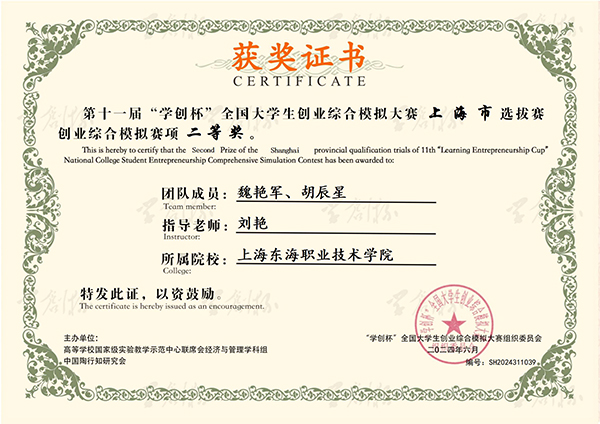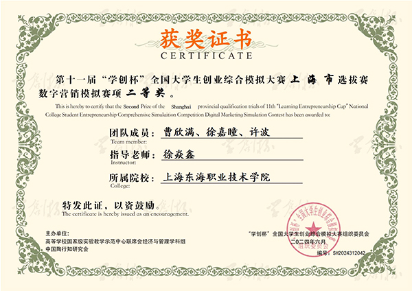 9月21日,第十一届“学创杯”全国大学生创业综合模拟大赛上海市预选赛在线上举行。信息工程学院徐焱鑫老师指导的由计算机应用技术专业中高职贯通(大数据方向)班的奚时律、夏凌峰、朱佳昱组成的队伍,经过激烈角逐,荣获数字营销赛项一等奖。此外,徐焱鑫老师指导的由曹欣满、徐嘉瞳、许波组成的队伍,以及张唐颉、金孜豪、谢卞强组成的队伍,分别荣获数字营销赛项二等奖。由刘艳、杨海俊老师指导的魏艳军、胡辰星组成的队伍,荣获综合创业赛项二等奖。