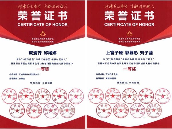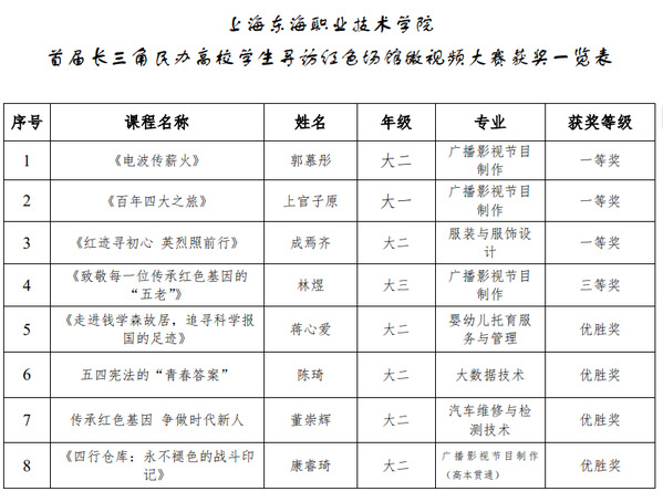 近日,“传承红色基因 争做时代新人”首届长三角民办高校学生寻访红色场馆微视频大赛颁奖仪式在上海杉达学院金海校区举行。我校在此次大赛中表现突出,共斩获一等奖3项、三等奖1项、优胜奖8项,学校荣获“优秀组织奖”,充分展现了我校学子的青春风采和红色教育成果。