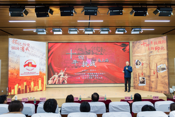 随后,师生们共同观看了“行走的思政课”纪实视频。跟随“行走的党课”教学模式创始人、上海市团校特聘教授张家禾的镜头与讲解,大家“云端”探访了天通庵车站、日军海军陆战队司令部旧址等历史遗址,以脚步丈量、以目光凝视那段不容忘却的岁月。视频之后,张家禾教授应邀走进课堂,以《十四年抗战与上海》为题,从“第一支常驻上海的侵华日军”到“两个军事法庭对侵略者的正义审判”等七个关键历史断面,深度解读了上海在十四年抗战中的战略地位与悲壮历程,还原了遗址背后波澜壮阔的历史画卷。