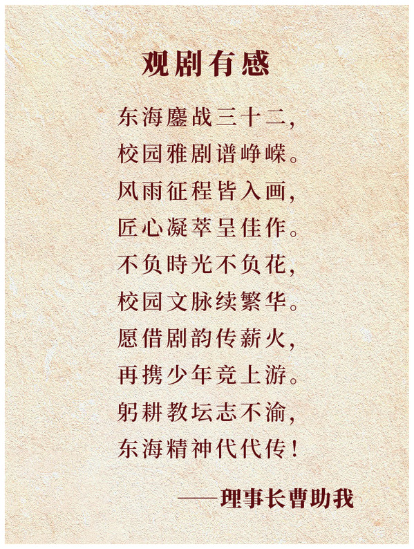 “东海鏖战三十二,校园雅剧谱峥嵘。风雨征程皆入画,匠心凝萃呈佳作。不负時光不负花,校园文脉续繁华。愿借剧韵传薪火,再携少年竞上游。躬耕教坛志不渝,东海精神代代传!”观看话剧结束后,理事长曹助我以诗寄意,分享了他的感悟与期许;师生们也结合剧情与表演,纷纷交流自己的观感与思考。
