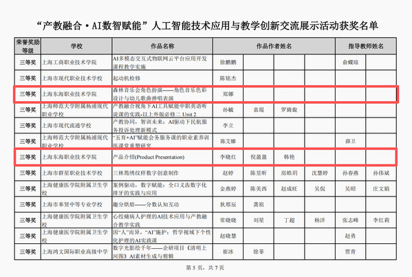 近日,由长三角电子信息职业教育集团、上海市高等职业院校电子与信息类专业教学指导委员会等单位联合主办的“产教融合·AI数智赋能”人工智能技术应用与教学创新交流展示活动圆满落幕。来自31所职业院校的132件作品同台竞技。教育学院教师团队凭借扎实的专业素养和突出的教学创新能力脱颖而出,共斩获二等奖2项、三等奖6项,充分展现了教育学院在人工智能技术与教育教学深度融合方面的探索成果与综合实力。