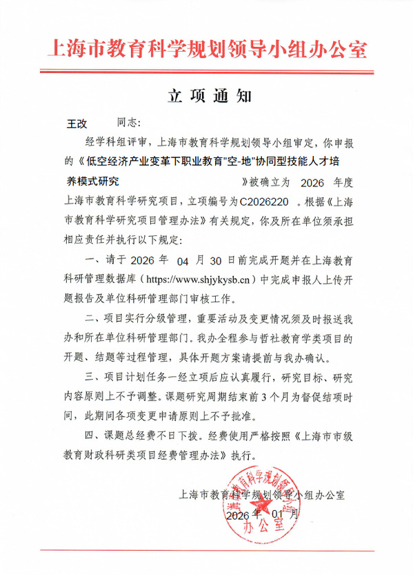 在“十五五”开局之年,我校科研工作迎来开门红!近日,从上海市教育科学规划领导小组办公室传来喜讯,在2026年度上海市教育科学研究项目立项名单中,我校张居阳申报的《人工智能赋能民办高职院校人才培养社会适应性提升的路径与机制研究》(立项编号C2026154)、王改申报的《低空经济产业变革下职业教育“空-地”协同型技能人才培养模式研究》(立项编号C2026220),双双荣列!我校已经连续两年在上海市教育科研项目立项中获得“双重”惊喜!