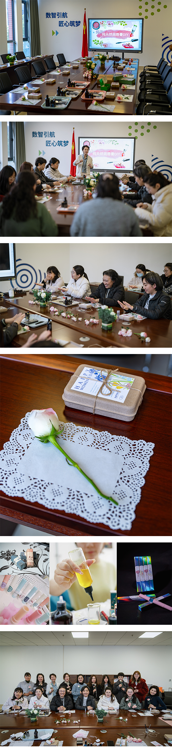 活动伊始,专业讲师深入浅出地介绍了各类精油知识,从精油的提取方法到独特功效,女教师们听得津津有味,不时交流互动。在随后的芳香疗愈体验环节,大家沉浸在精油的馥郁芬芳中,舒缓了身心的疲惫和压力。最令人期待的是手工制作环节,女教师们化身“巧手达人”,精心调配精油、选择色粉,认真制作属于自己的唇膏。当一支支精美的唇膏诞生时,大家脸上洋溢着满足的笑容。