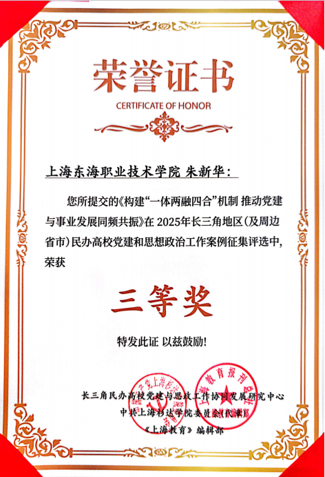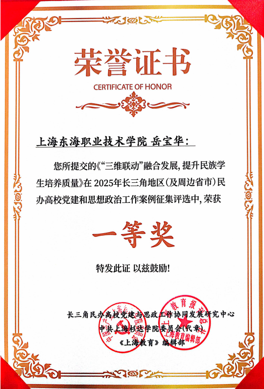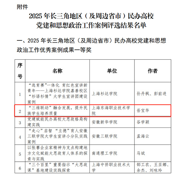 近日,由长三角民办高校党建与思政工作协同发展研究中心(上海杉达学院)、《上海教育》编辑部联合开展的“2025年长三角地区(及周边省市)民办高校党建和思想政治工作案例征集评选”结果公布,我校报送的两项案例《“三维联动”融合发展,提升民族学生培养质量》(作者:岳宝华)和《构建“一体两融四合”机制,推动党建与事业发展同频共振》(作者:朱新华)分别荣获一等奖和三等奖。